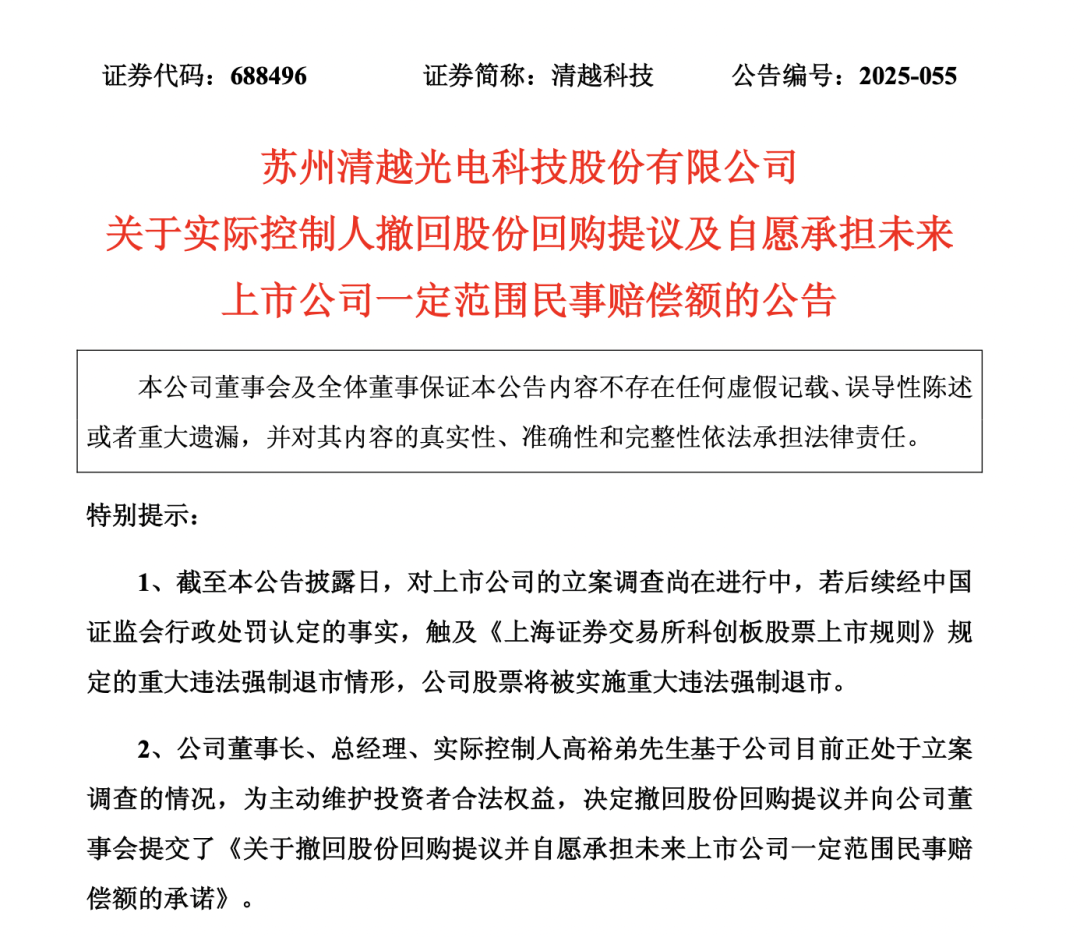 12月12日晚間,清越科技(688496)公告,公司董事長、總經(jīng)理、實(shí)際控制人高裕弟決定撤回此前的股份回購提議,并自愿承擔(dān)未來公司可能產(chǎn)生的一定范圍的民事賠償額,金額不低于1000萬元。