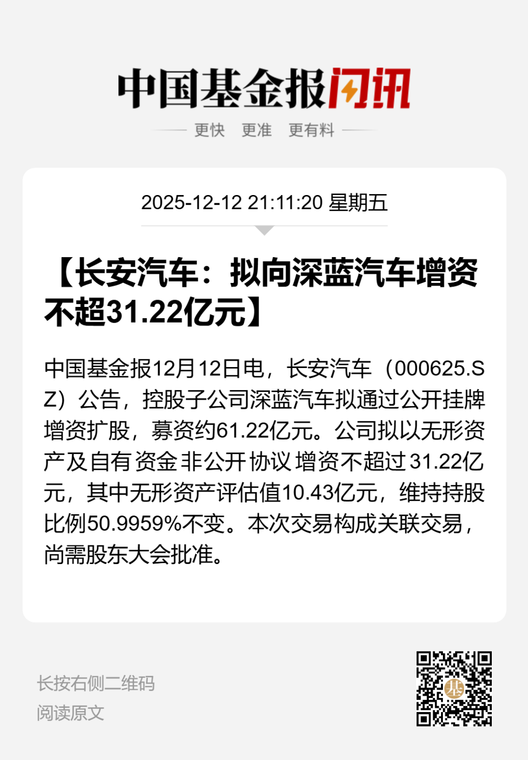 12月12日晚間,長安汽車(000625)發(fā)布公告稱,公司控股子公司深藍汽車科技有限公司(以下簡稱深藍汽車)擬以公開掛牌方式增資擴股,預計募資規(guī)模約61.22億元,其中公司擬參與增資不超過31.22億元。