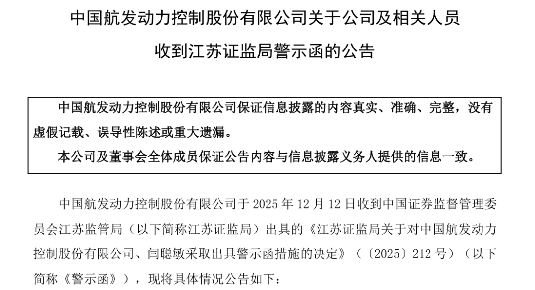 12月12日盤后,航發(fā)控制(000738)公告稱,公司及相關(guān)人員收到江蘇證監(jiān)局警示函。