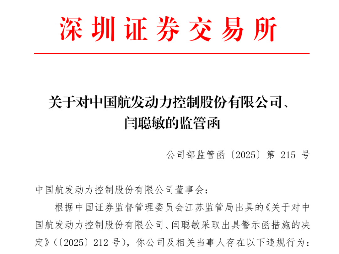 與此同時,因上述事項,深交所于12日向航發(fā)控制、閆聰敏下發(fā)監(jiān)管函。
