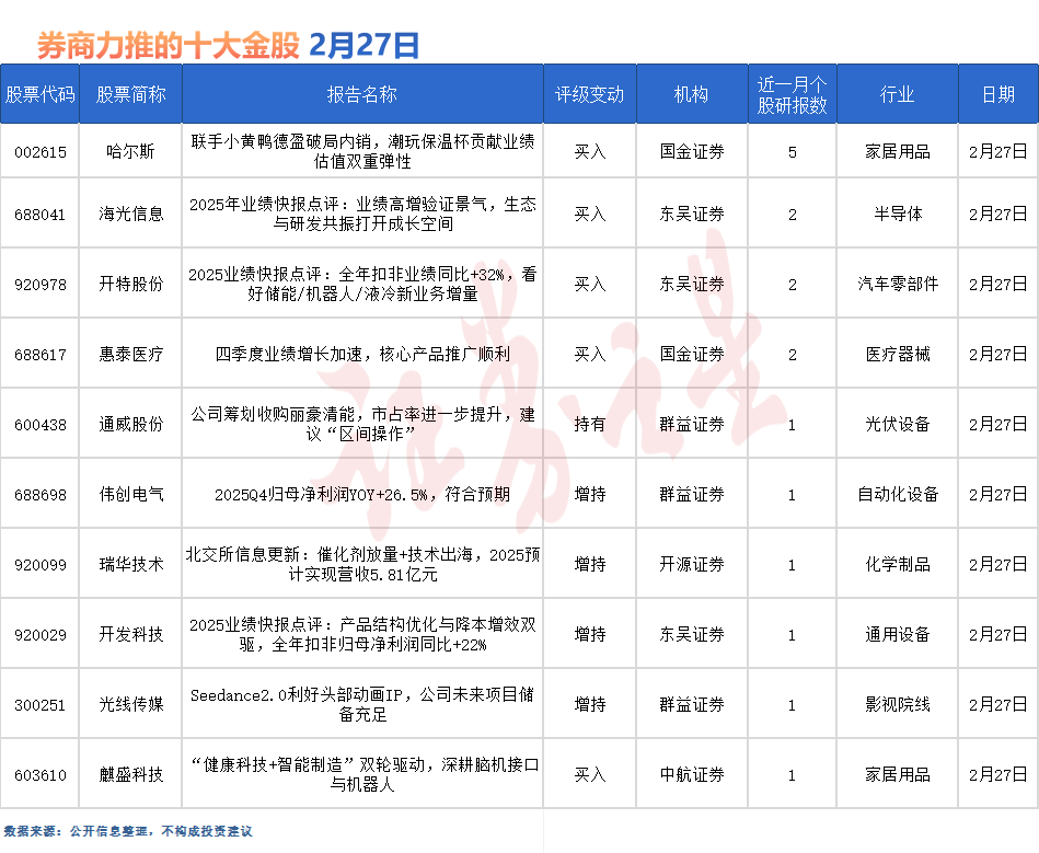 據(jù)證券之星數(shù)據(jù)庫不完全統(tǒng)計(jì),2月27日券商共給予超10家A股上市公司“買入”評(píng)級(jí)。從行業(yè)分布看,券商2月27日關(guān)注的個(gè)股聚焦于家居用品、半導(dǎo)體、汽車零部件、醫(yī)療器械、光伏設(shè)備、自動(dòng)化設(shè)備、化學(xué)制品、通用設(shè)備、影視院線等行業(yè)。