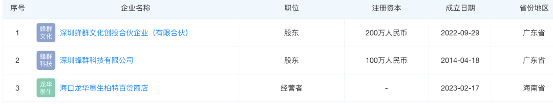 天眼查顯示,留幾手(本名劉爽)持有蜂群兩家公司的股權(quán),分別為深圳蜂群科技有限公司(5%)、深圳蜂群文化創(chuàng)投(885413)合伙企業(yè)(有限合伙)(15%)。其中,深圳蜂群科技有限公司成立于2014年,該公司于2023年7月被列入經(jīng)營異常。