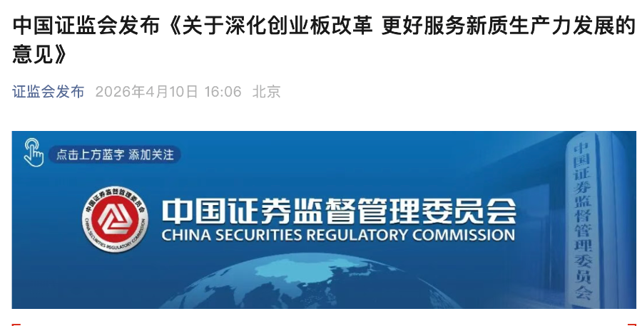 21世紀(jì)經(jīng)濟(jì)報(bào)道 記者伊銘韻 4月10日,證監(jiān)會(huì)發(fā)布《關(guān)于深化創(chuàng)業(yè)板改革 更好服務(wù)新質(zhì)生產(chǎn)力發(fā)展的意見(jiàn)》。此次改革提出一系列針對(duì)性改革舉措: