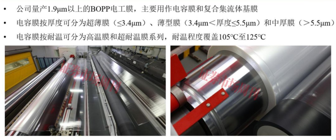 BOPP電工膜是由聚丙烯樹脂經(jīng)過雙向拉伸工藝制成的一種絕緣介質(zhì)材料,具有自愈性好、耐壓高、厚薄均勻性好、介質(zhì)損耗小、比重低等特點,下游應(yīng)用領(lǐng)域包括薄膜電容器用聚丙烯薄膜(電容膜)和復(fù)合銅箔基膜。 在薄膜電容器中,BOPP電工膜起到使被間隔的兩端電極積蓄電荷的作用,其性能直接影響電容器容值大小、穩(wěn)定性和使用壽命等核心指標(biāo)。在鋰電池(884309)復(fù)合集流體(886020)中,BOPP電工膜可以作為負(fù)極復(fù)合銅箔基膜,能有效提高電池安全性并降低成本。