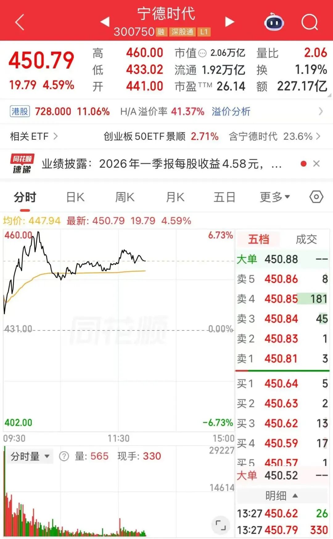 4月16日,寧德時(shí)代(300750)午后延續(xù)漲勢(shì),截至發(fā)稿,漲4.59%,報(bào)450.79元,成交額超227億元。公司總市值達(dá)2.06萬億元,位居A股市值第三;早盤一度漲超 6%,短暫反超中國(guó)石油(601857)、工商銀行(601398),躍居A股市值第二。