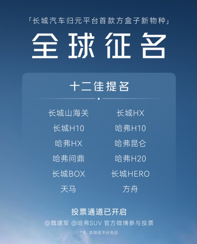 將時(shí)間的指針回?fù)?,此次新車命名從一開始就設(shè)定了清晰的路徑:要面向全網(wǎng)公開征集,堅(jiān)持用戶共創(chuàng)。4月10日,官方從近30萬(wàn)條網(wǎng)友留言中篩選出候選名稱,隨即在魏建軍微博(WB)開啟全民投票,哈弗也同步推出有獎(jiǎng)互動(dòng),用戶參與熱情持續(xù)走高。