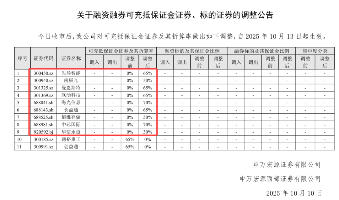 10月10日,包括申萬宏源證券(000562)、招商證券在內的部分券商收市后再度調整了融資融券可充抵保證金證券及折算率。