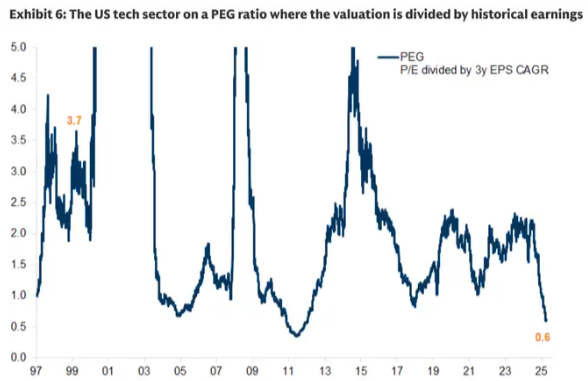 此外,華爾街投行通過研報發(fā)表看漲觀點。高盛(GS)策略師Peter Oppenheimer明確指出科技板塊回調(diào)構(gòu)成“價值機(jī)會”,并列證全球科技股遠(yuǎn)期PEG比率已跌破1,滾動PEG指標(biāo)處于2005年以來低位,分析師對2026及2027年盈利預(yù)期持續(xù)上修,高凈資產(chǎn)收益率亦支撐當(dāng)前估值水平。